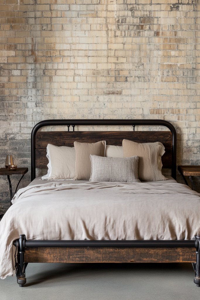 Visualize a sturdy black or gray matte metal frame with clean lines and a slightly distressed finish. Reclaimed wood panels act as headboards or side accents, adding warmth and texture. The bedding features neutral tones with rugged textiles like burlap or linen, complemented by a few metal or wooden decorative elements. The overall feel is a balanced mix of rugged industrial and cozy rustic.