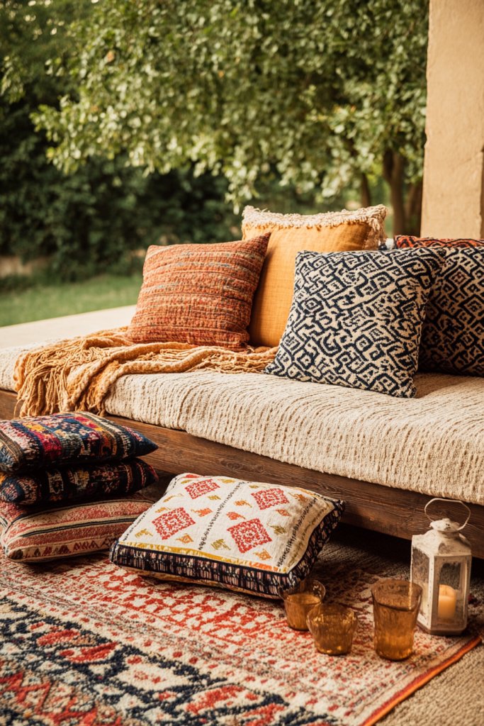 5. Boho Chic Day Bed with Layered Textiles and Floor Cushions