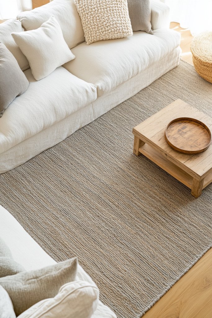 Add subtle pattern or texture within the neutral palette—think geometric patterns or braided designs. Incorporate textured cushions or throws that match the rug’s tone for a layered, harmonious look. Try different materials seasonally to keep your space feeling fresh. Use the rug as a base to build your decor around.