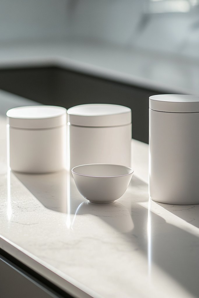 Visualize a pristine countertop with only a few essential tools—perhaps a cutting board, a neatly arranged utensil holder, and a minimalist canister set. Behind closed cabinet doors, appliances and excess utensils are tucked away. The open space invites you to cook and entertain effortlessly, while the hidden storage maintains clutter-free aesthetics.