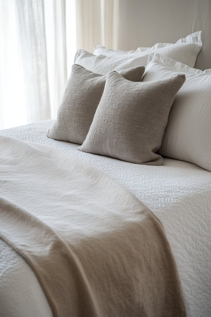 Picture crisp white sheets with a simple, textured duvet cover in a muted tone. Add a few matching pillows in soft fabrics like linen or cotton. The bedding’s understated elegance complements the room’s architecture and textures, making the space look calm and inviting. Natural light enhances the neutral palette, adding warmth.
