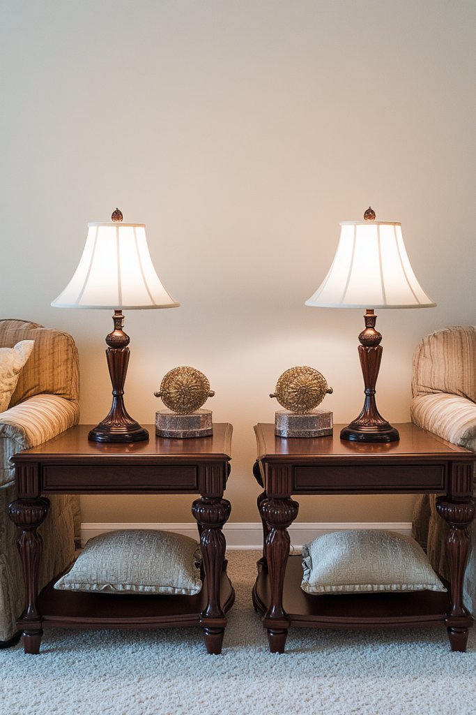 Imagine two matching side tables flanking a sofa, each topped with a sculptural object or a simple light fixture. Artwork or mirrors are centered above, creating a mirror image that anchors the room. The balanced arrangement guides the eye and creates a peaceful, orderly environment. It’s the visual equivalent of a deep breath.