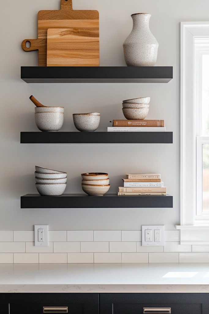 Picture floating shelves mounted on a wall painted in a soft matte hue. They hold neatly stacked dishes, a few decorative bowls, or minimalist storage boxes. The open design invites the eye to move freely across the room, creating a sense of flow. Natural light hits the shelves, highlighting textures and subtle colors. It’s a simple setup that makes your space look curated and inviting.