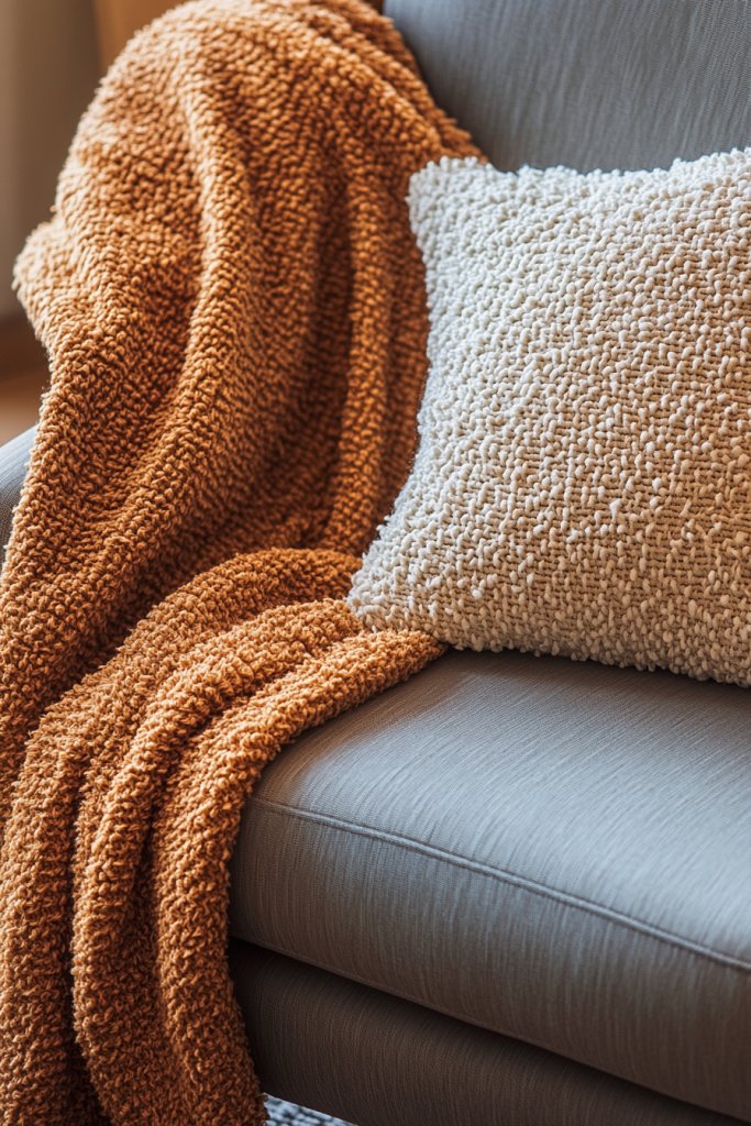 Imagine a soft cream throw blanket with chunky knit texture draped over a sleek sofa. Pair it with woven cushions in natural fibers like linen or jute for a tactile contrast. A shaggy rug underfoot adds visual depth and invites you to kick off your shoes. The varied textures catch the light differently, creating a rich, multi-dimensional environment. It’s like your home is giving a warm hug.