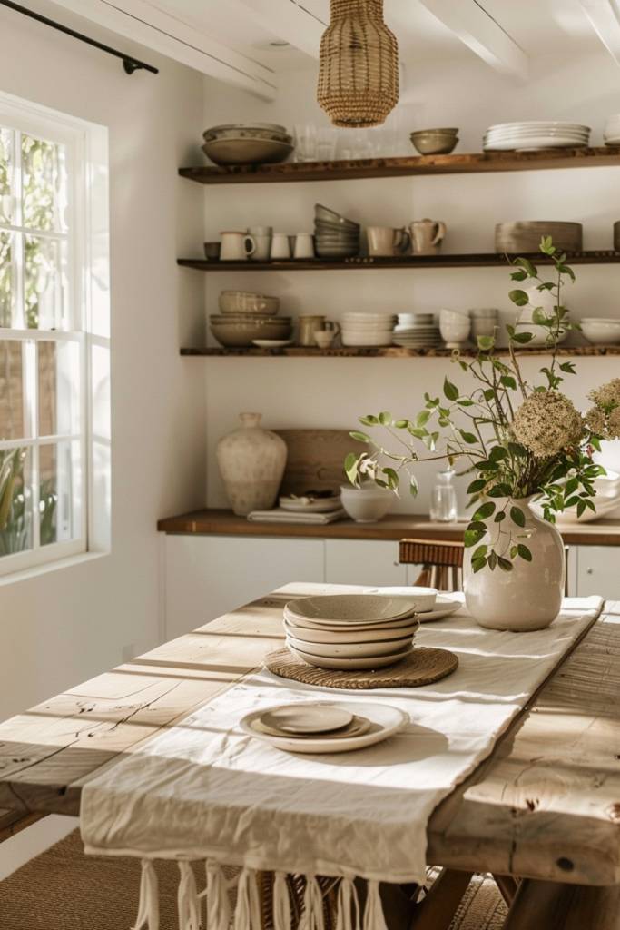 Adding open shelving not only allows you to showcase your favorite dining pieces but also sets the stage for introducing lush greenery into your space. Picture trailing ivy cascading softly over a rustic wooden shelf or vibrant succulents nestled among your cherished ceramics. These living elements breathe life into your dining area, creating a harmonious balance between the aesthetic and the organic.