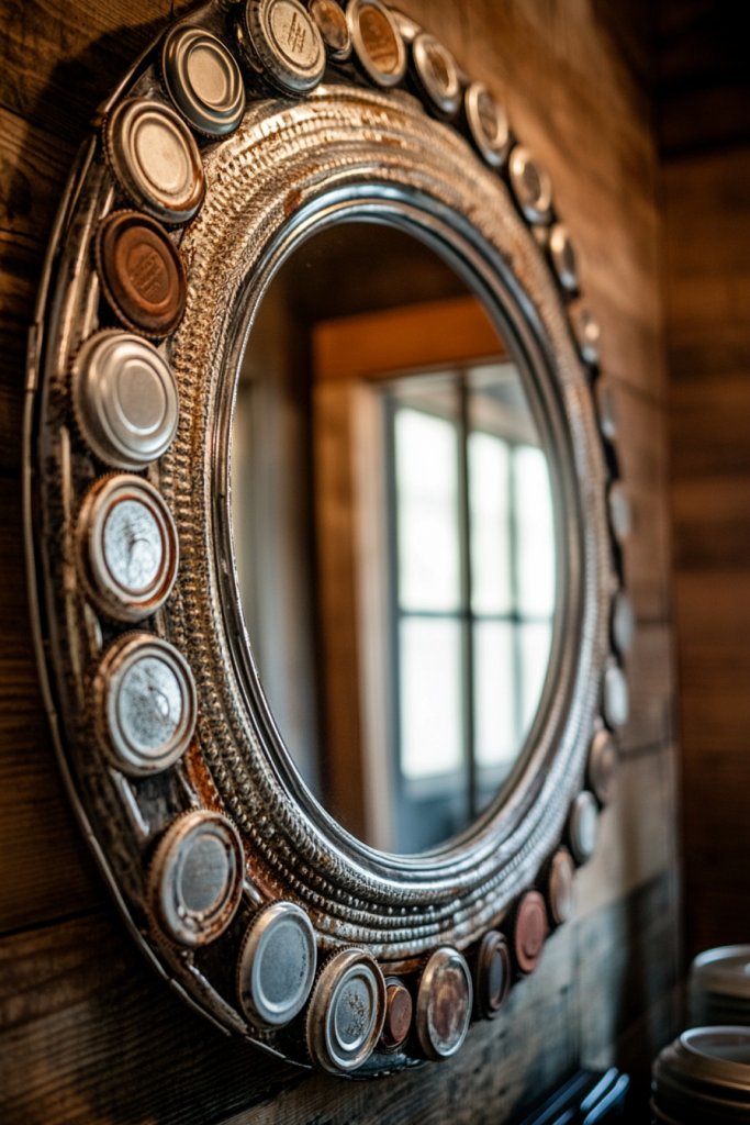 You can customize this look by choosing different paint finishes—matte for a shabby chic look or metallic for a bit of glam. For a more colorful vibe, mix and match lids in various shades. This idea adapts well to small or large mirrors, and you can even add decorative elements like twine or faux greenery for seasonal flair. It’s perfect for farmhouse, cottage, or industrial styles.