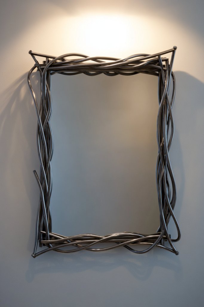 Picture a geometric frame made from black or metallic-finished wire, bent into clean rectangles or abstract shapes. The thin, curved lines create a delicate but bold border that highlights your mirror. The sleek finish reflects light and adds a contemporary touch. It’s like a piece of modern sculpture framing your reflection.