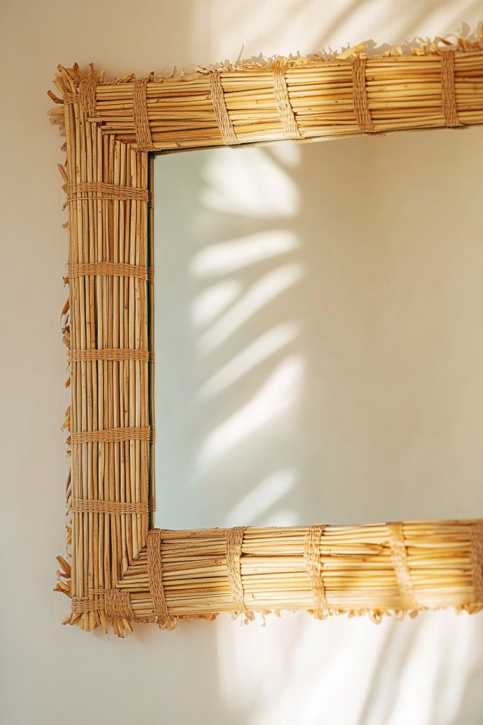 Select a reed or bamboo mat that fits your mirror size. Cut to shape if necessary and secure with hot glue or waterproof adhesive. Reinforce corners for stability and prevent warping. Attach the mat around the mirror with strong adhesive or mounting strips. Seal with a clear protective coating to withstand moisture. Make sure the edges are smooth and secure.