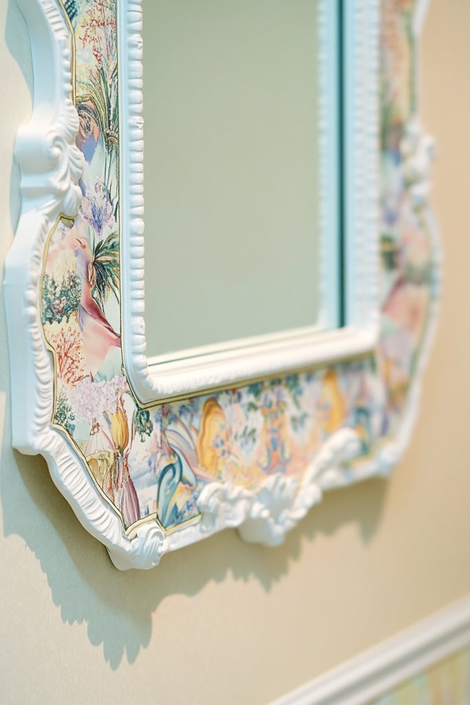 Mix and match different themed papers for seasonal or mood changes. For a subtle look, choose muted tones or monochrome prints. To make it more sophisticated, add metallic accents or lace patterns. This technique also works well with a vintage or shabby chic aesthetic, especially when paired with distressed furniture and soft textiles. It’s adaptable to small or large mirrors alike.