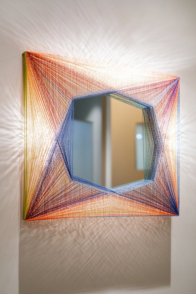 Picture a geometric or abstract pattern of colorful strings stretched between small nails or pins around your mirror. The intricate web of threads creates a dynamic, textured border that feels both playful and sophisticated. Bright colors or metallic threads can add vibrancy, while monochrome schemes lend a sleek, minimalist vibe. The result is a three-dimensional art piece that energizes the space.