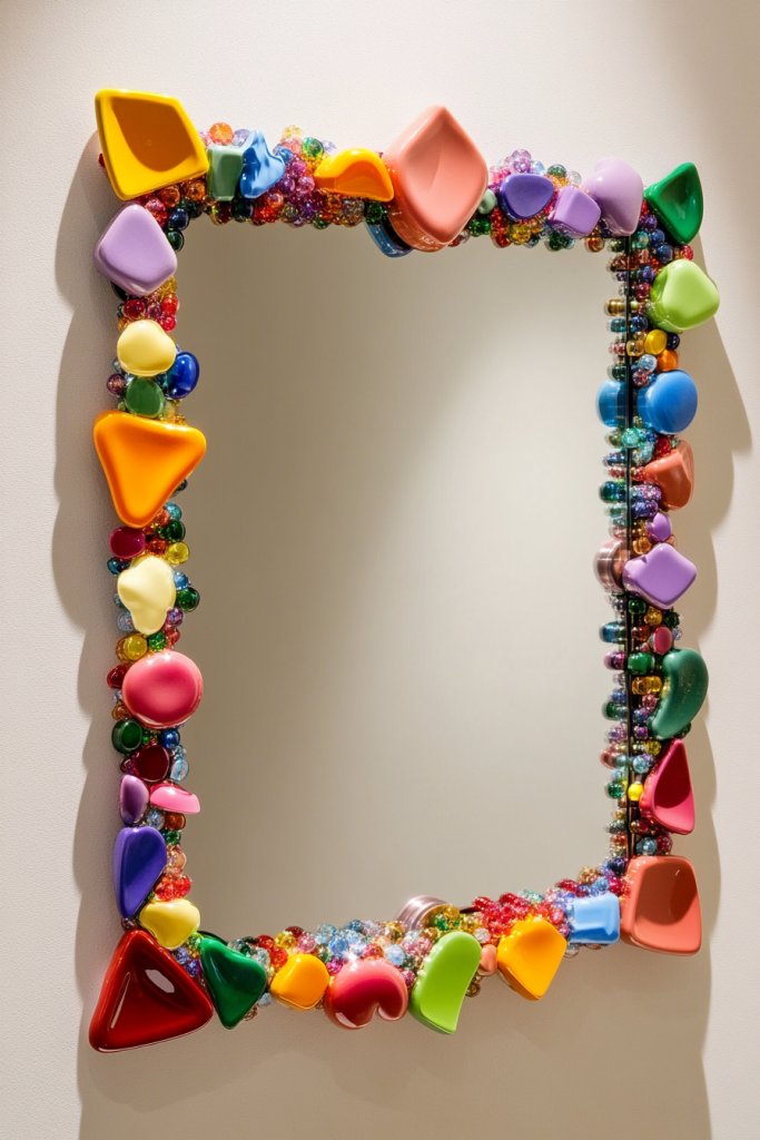 Choose caps that match your decor palette or go for a rainbow of colors for maximum impact. Create patterns or random arrangements—either way, it’s a statement. For a more refined look, set caps into a clear resin or attach them directly to a sturdy backing. This technique suits boho, eclectic, or even industrial styles, and can be scaled to fit various mirror sizes.