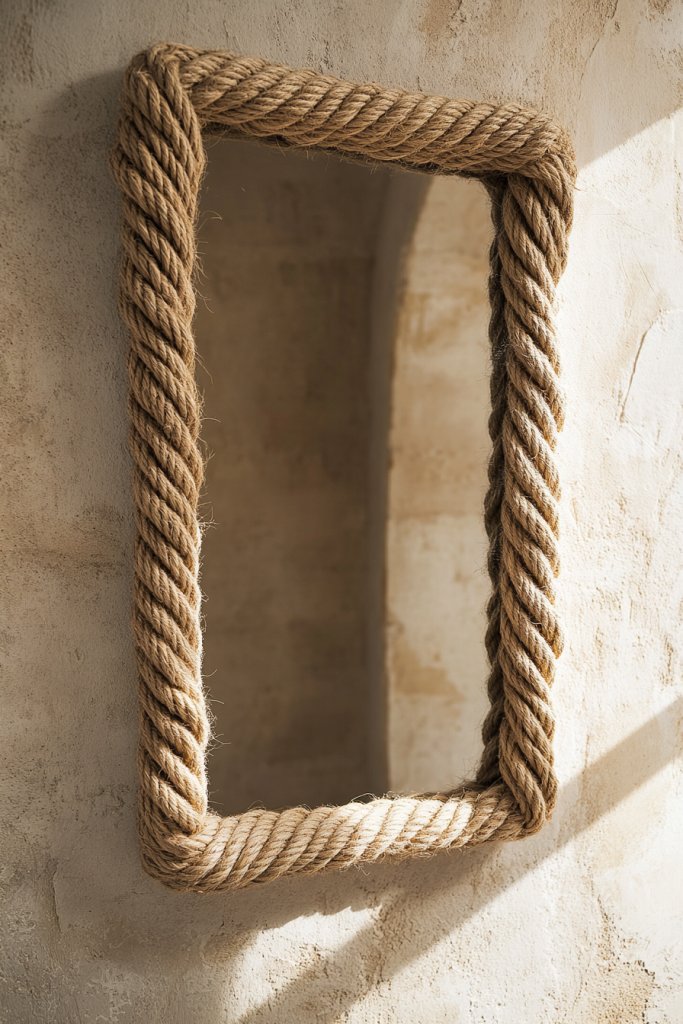 Want to add a natural, coastal vibe to your bathroom without spending a lot? Twine or jute rope is an inexpensive material that can instantly give your mirror a warm, textured border. It’s perfect for creating a relaxed, earthy atmosphere. Who needs fancy frames when you have rustic charm?