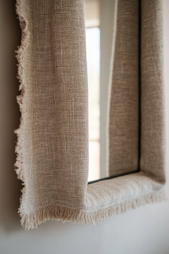 Use different fabrics for different seasons or occasions—think chunky knits for winter or light linen for summer. Layer fabrics for a patchwork effect or add decorative trims and tassels for extra flair. This idea works well for small or large mirrors and complements eclectic, boho, or rustic styles.