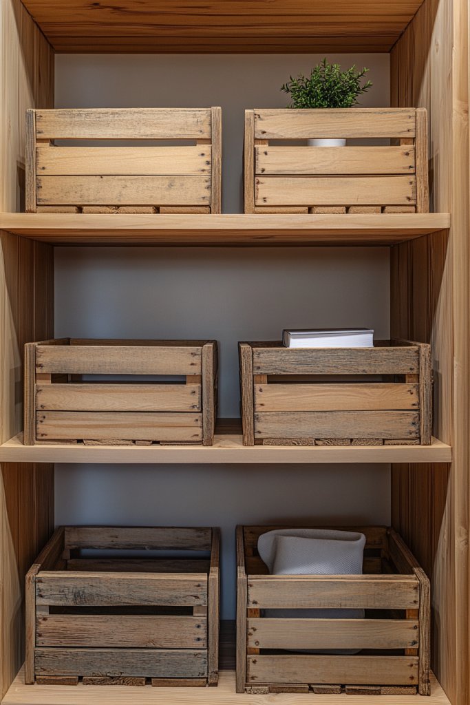 Paint or stain the crates in colors that match your decor or leave them natural for a rustic vibe. Mix sizes for visual interest or keep uniform for a streamlined look. Secure the crates together with brackets or straps for stability. Use liners or fabric inserts inside for delicate items, and add labels or tags for easy identification.