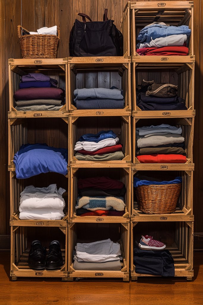 Imagine rustic wooden crates painted in a soft matte hue, stacked neatly or mounted directly onto the wall. The crates create a layered shelving system that feels both vintage and modern. Clothes, shoes, and accessories sit comfortably inside, with textures contrasting against the wall. The open design invites you to see everything at a glance, making organization effortless.