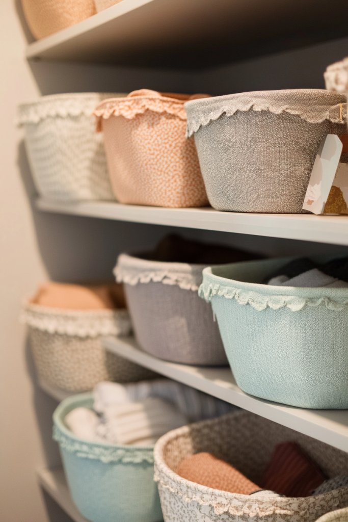 10. Use Fabric-Covered Baskets for Stylish Storage on Shelves