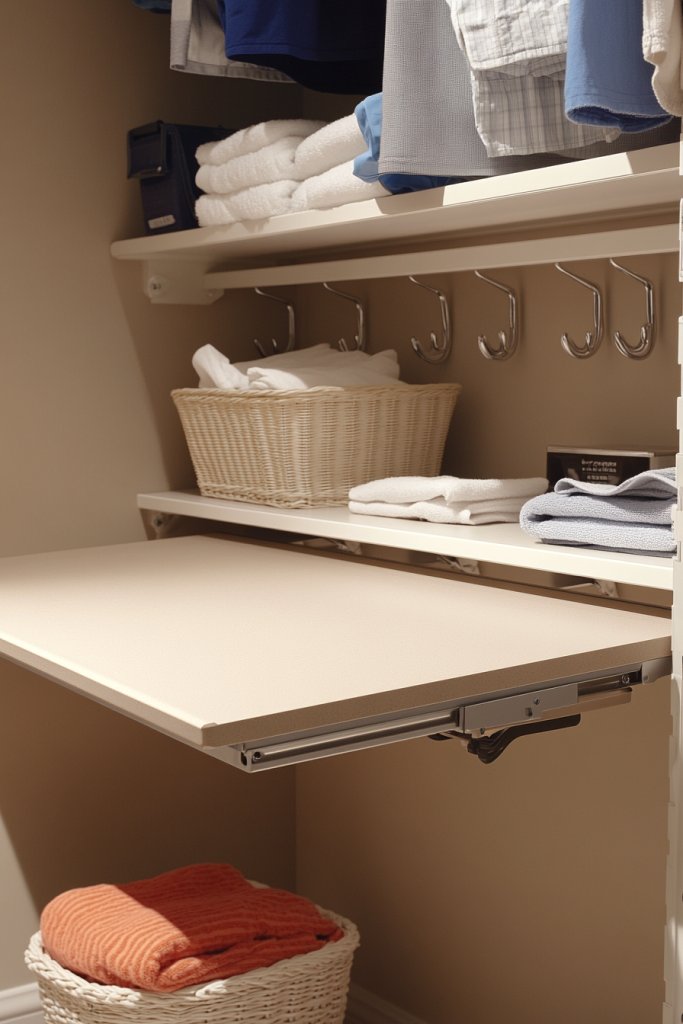 Visualize a slim cabinet or wall-mounted panel that folds down into a small table or surface. When needed, it swings out or opens up to provide a sturdy workspace. Store laundry baskets or folded items nearby, with hooks or shelves for tools. The compact design blends into your closet, ready when you need it, hidden when not.