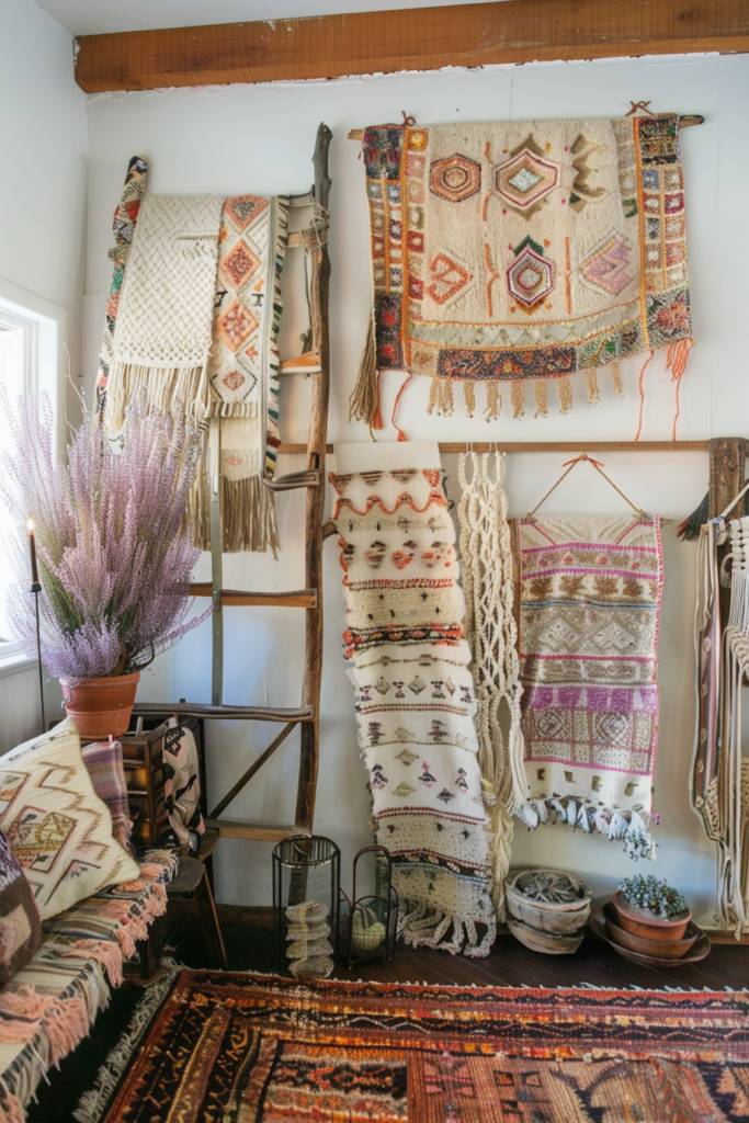 Start by measuring your wall to determine the best size for your fabric art. A simple way to hang them is by using dowels or embroidery hoops, allowing for easy changes when you want a refresh. You can even experiment with layering different patterns and colors for a bohemian vibe.
