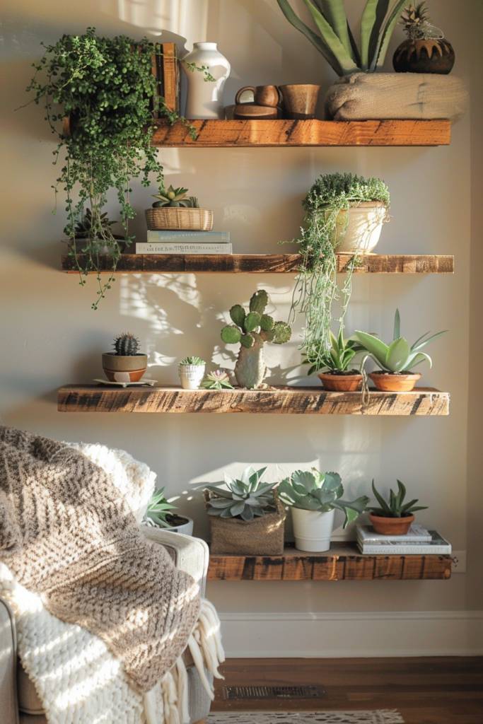 When hanging your shelves, consider pairing them with industrial brackets for a modern twist or going with simple rope for a more laid-back vibe. They’re perfect for displaying cherished books, plants, or your favorite collectibles.