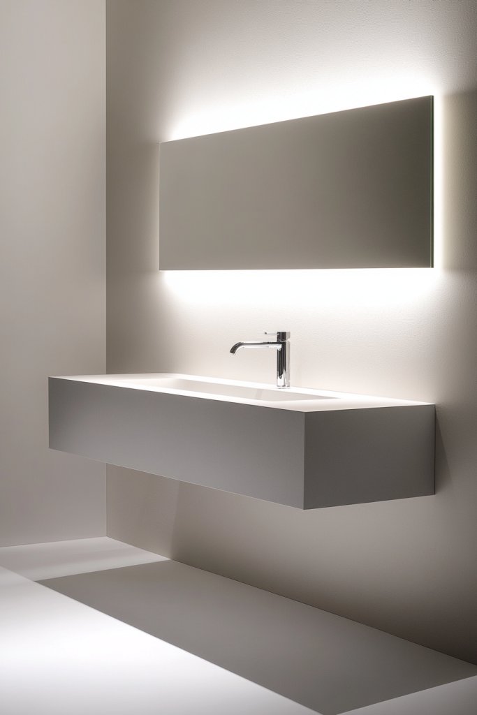 Imagine a wall-mounted unit with clean lines and a matte finish, floating effortlessly above a textured tile floor. The open space underneath makes the room feel bigger, while a modern vessel sink adds a sculptural element. Soft, warm lighting reflects off its smooth surface, creating a calming glow. It’s like turning your bathroom into a high-end boutique with minimal effort.