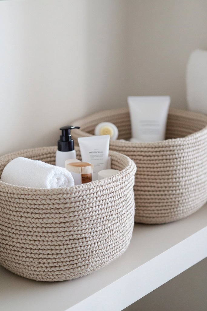 Picture a set of woven rattan baskets placed under the sink or on open shelves, holding towels, brushes, and other essentials. Clear acrylic bins keep smaller items visible and easy to find, while decorative fabric-lined baskets add a cozy touch. These containers introduce natural textures and colors that soften the overall look. It’s both functional and pretty.