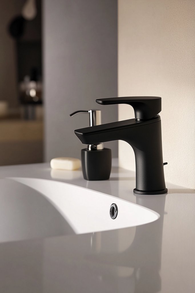 Visualize a sleek matte black faucet with angular lines paired with a marble countertop or a warm gold fixture shining against a dark tile wall. The contrast creates a focal point that draws attention and elevates the overall aesthetic. The finish’s texture adds depth and sophistication, making your sink area look polished and intentional.