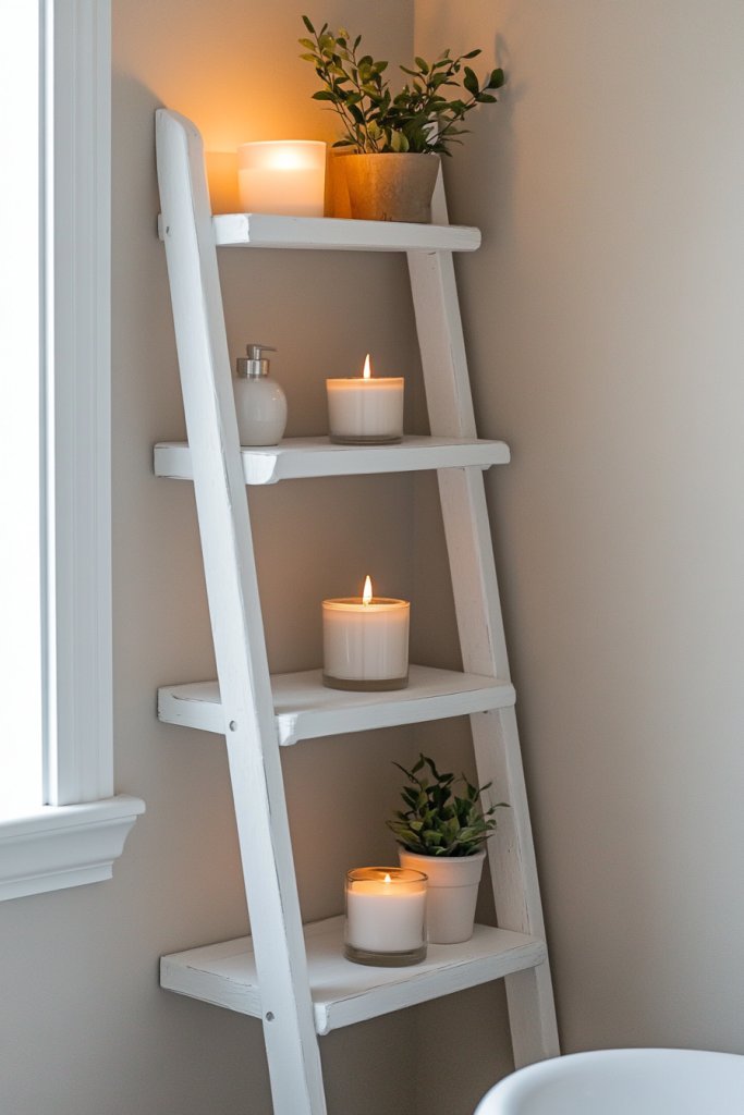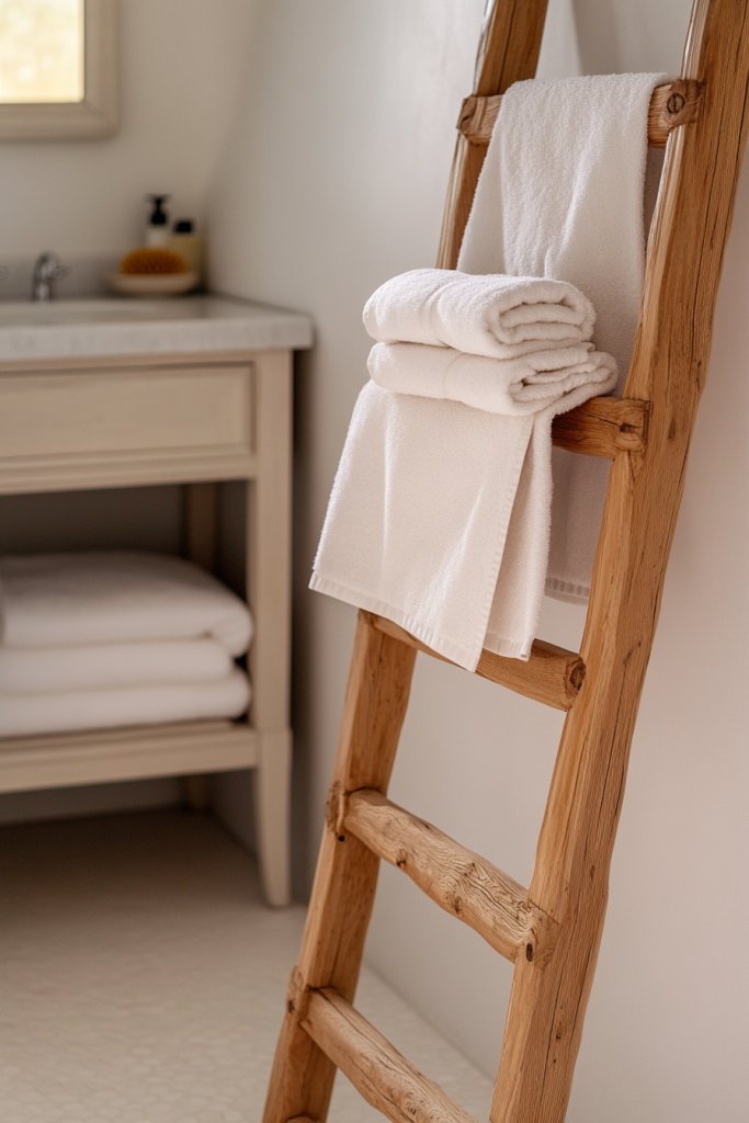 Picture a tall, wooden ladder leaning against the wall, with shelves holding folded towels, jars, and decorative accents. The open design keeps everything accessible and adds warmth with natural wood tones. It’s a modern twist on traditional shelving that enhances your bathroom’s aesthetic.
