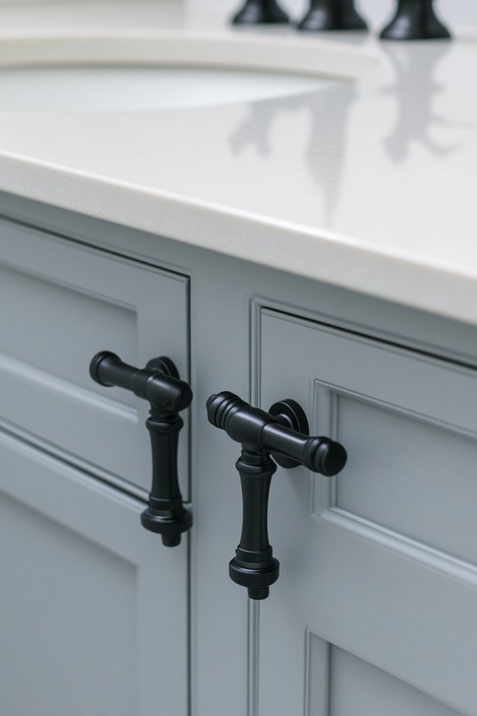 Picture sleek matte black cabinet pulls contrasting against a soft pastel vanity, or brushed nickel faucets gleaming under bright lighting. The hardware’s matte or brushed finish adds a subtle texture, making everything feel more modern and refined. These finishes hide fingerprints and water spots better, keeping your bathroom looking cleaner longer.