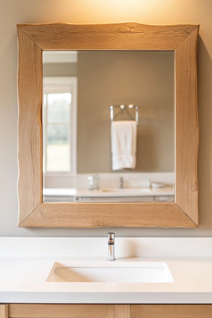 Imagine a thick wooden frame with a natural or painted finish encasing your mirror. The textured edges and decorative trim create a focal point that draws the eye. Bright or warm lighting reflecting off the frame enhances its charm, making your bathroom feel curated and stylish.