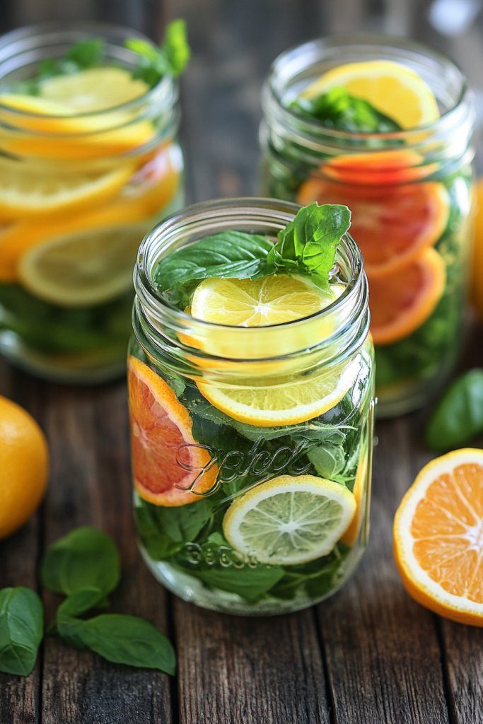 Imagine a collection of clear mason jars, each filled with bright orange and yellow slices of citrus, nestled among sprigs of fragrant herbs like basil or mint. The fruits’ vivid colors pop against the transparent glass, while the herbs add a lush green contrast. The jars sit clustered together, with sunlight filtering through, casting playful shadows on your table. It’s a combination of freshness and color that screams summer.
