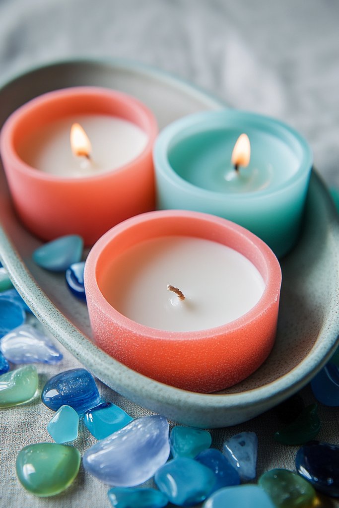 Picture layered candles in shades of coral and aqua, arranged on a decorative tray or mirrored surface. Surround the candles with small, smooth sea glass pieces in matching colors, reflecting the candlelight with a gentle shimmer. The candles’ warm glow contrasts beautifully with the cool tones of the glass, creating a serene, calming ambiance. It’s a minimalist yet elegant nod to the seaside, perfect for summer evenings.