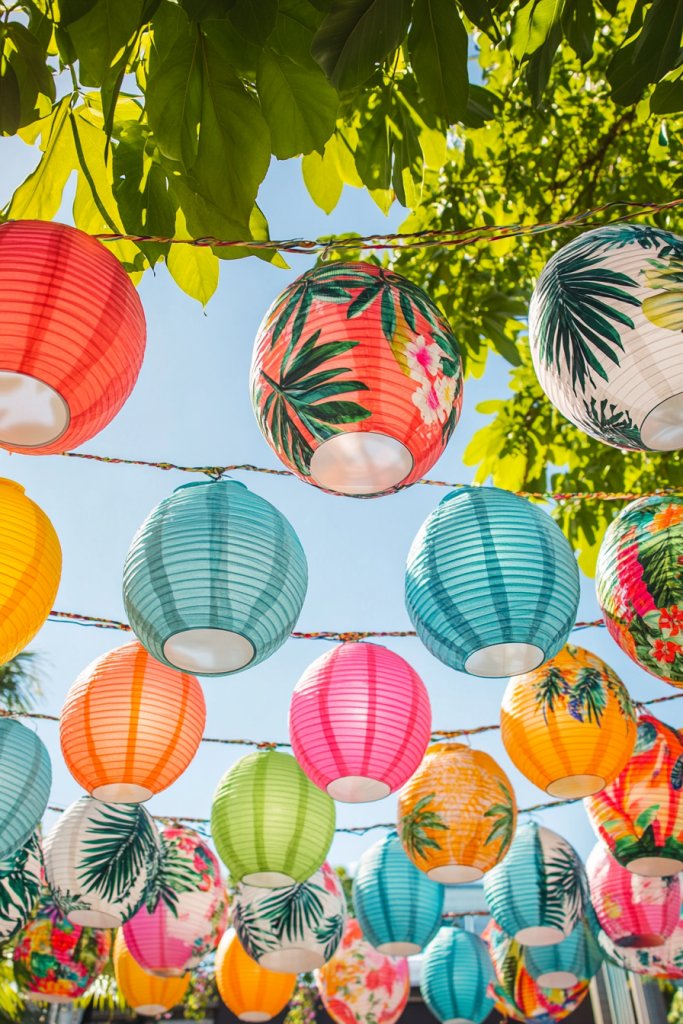 Start with plain paper lanterns available at craft stores or online. Print or draw tropical patterns onto adhesive or directly onto the paper using markers or paint. Use a string or wire to hang the lanterns securely. Light LED candles or small battery-powered lights inside for safety and convenience. Adjust the spacing to ensure a balanced, festive look. These lanterns are lightweight and easy to install, perfect for DIY decor.