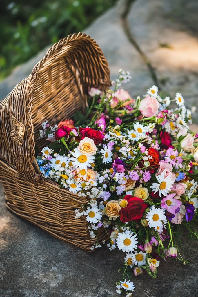 15. Vintage Picnic Basket Filled with Seasonal Blooms