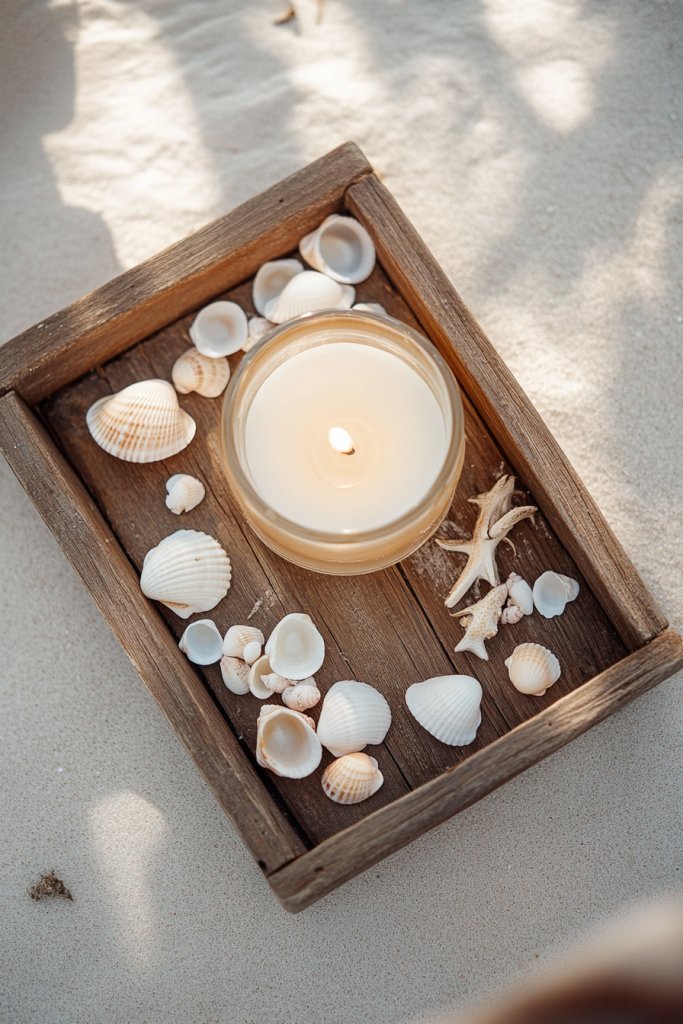 You can customize the tray’s contents with different shells or add small starfish for variety. For a more refined look, replace candles with LED tealights or lanterns—safety first! Incorporate additional coastal elements like glass jars filled with sand or miniature boats for added depth. Change the tray’s size and shape depending on your table’s dimensions or go for a layered arrangement with varying heights.