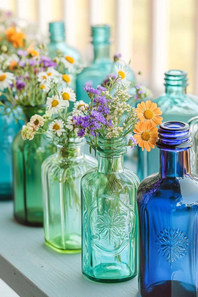 4. Colorful Glass Bottles with Wildflower Bouquets
