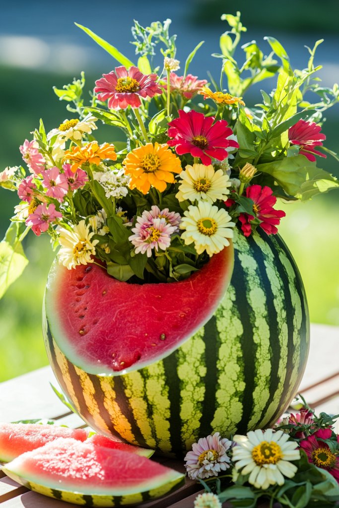 Visualize a large watermelon, carefully cut to create a hollow cavity. Bright blooms like daisies, zinnias, or petunias spill out of the watermelon’s opening, creating a lush, colorful display. The watermelon’s deep green rind contrasts with the vivid flowers, while its round shape adds a soft, inviting feel. Placed on a rustic tray or wooden board, it becomes an eye-catching, edible centerpiece that sparks conversation.