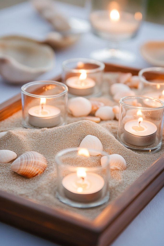 Fill your chosen container with a layer of fine sand, smoothing it out with a spatula. Arrange shells randomly or in patterns for a balanced look. Place tealight candles securely among the shells—preferably in holders to prevent tipping. Light the candles just before the event, and keep the display away from flammable materials or direct sunlight. You can prepare this setup hours in advance and light the candles at the last moment. It’s simple, inexpensive, and instantly transports your guests to the coast.