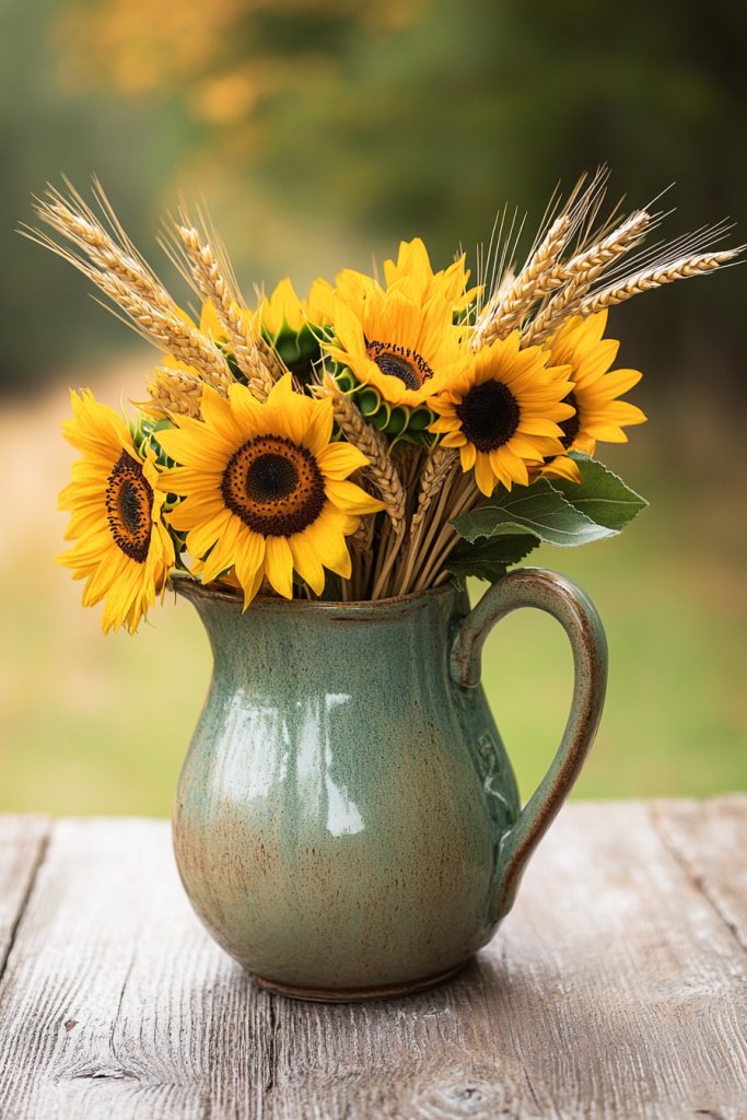 Envision a weathered, vintage pitcher filled with a large bouquet of bright yellow sunflowers, their faces turned towards the light. Accompanying the flowers are sprigs of wheat, adding texture and height. The arrangement sits on a wooden table or a linen cloth, with the sunflowers’ broad petals contrasting beautifully with the slender wheat stalks. It’s a natural, cheerful display that evokes harvest time and countryside serenity.
