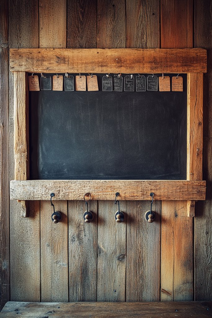 Picture a wide barn wood board with several embedded narrow chalkboard strips, either painted directly or inset with chalkboard material. Hooks hang along the bottom or sides, ready for notes, keys, or reminders. The textured wood serves as a warm backdrop, while the chalk strips invite daily updates. This setup balances rustic charm with practical use.