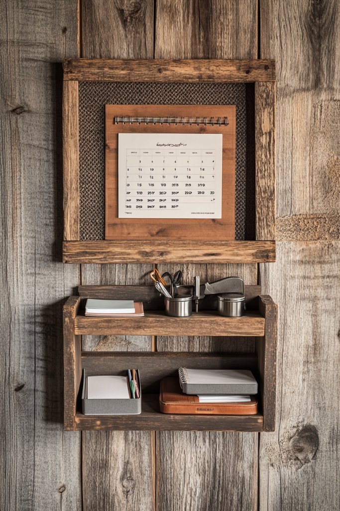 Envision a large barn wood framed panel with small, integrated shelves or cubbies along the bottom or sides. These shelves hold pens, notepads, or decorative items, while the calendar area displays dates or plans. The textured wood and simple design create a cozy, farmhouse vibe. It’s a visual anchor that keeps everything you need within reach.