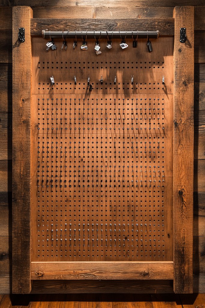 Paint or stain the barn wood to match your decor. Use different pegboard colors or patterns for visual interest. Customize the hooks and accessories based on your needs—pens, small containers, or decorative items. This setup works well in kitchens, craft rooms, or garages, and can be scaled to fit large walls or compact spaces.