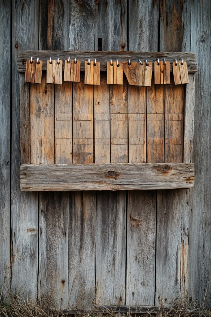 Visualize a sturdy barn wood panel with small wooden tabs labeled with months, seasons, or special dates. The tabs slide into slots or are attached with small pegs, allowing quick changes. Natural wood textures, combined with painted or stamped labels, create a warm, inviting look. The visual rhythm of tabs adds a tactile dimension to your planning.