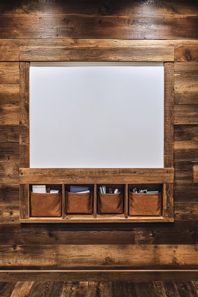 Picture a large barn wood panel with a recessed or embedded dry erase surface, framed in weathered wood. Adjacent or below, small fabric or leather pockets hang for storing pens, papers, or small tools. The textured wood combined with sleek whiteboard surfaces creates a cozy yet modern vibe. It’s a hub of activity that invites interaction.