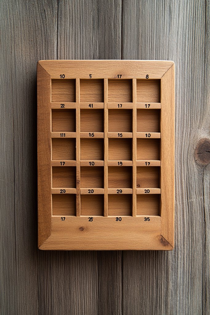 Envision a smooth, sanded barn wood panel with small rectangular or circular cut-outs arranged in a grid pattern. Behind each window, you can place transparent sheets or paper displaying dates or reminders. The natural grain of the wood frames the cut-outs, creating a subtle contrast that’s easy on the eyes. The overall effect is understated elegance with a rustic edge.