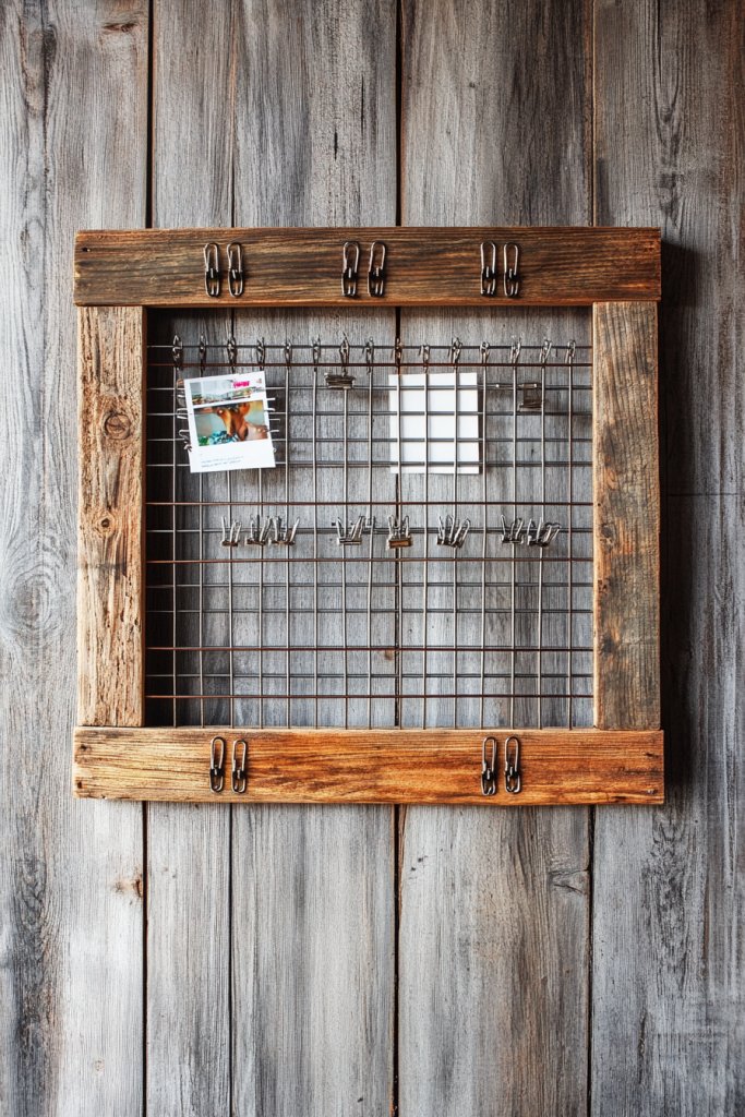 Visualize a large barn wood frame enclosing a metal wire grid, with clip holders hanging from the grid’s intersections. Photos, notes, or date cards clip onto the wire, making it easy to change content frequently. The textured, weathered wood contrasts with the sleek metal grid, adding rustic charm. It’s a dynamic display that feels both organized and inviting.
