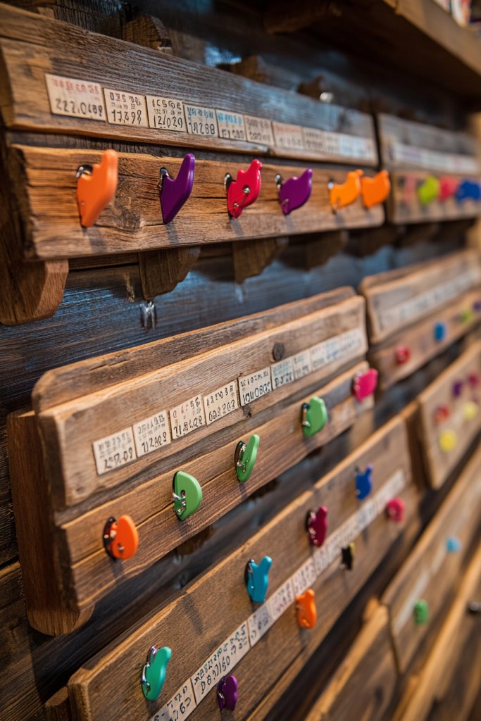 Paint or stain the tabs in seasonal colors—reds and oranges for fall, cool tones for winter. Use decorative stamps or hand-lettered labels for a personal touch. You can also add themed icons or motifs on the tabs for holidays or special occasions. This design adapts to various wall sizes and can be part of a larger farmhouse or vintage decor scheme.