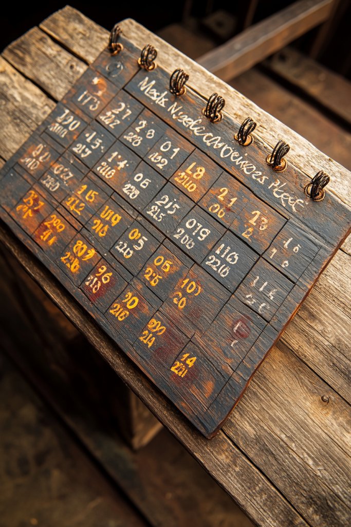 Cut and sand a piece of barn wood to your preferred size, then create shallow slots using a router or chisel. Prepare date cards from thick paper or thin wood, writing the dates clearly. Insert the cards into the slots, updating daily or weekly. Mount securely with wall anchors, ensuring the slots are level. Regularly replace or rearrange the cards as needed.