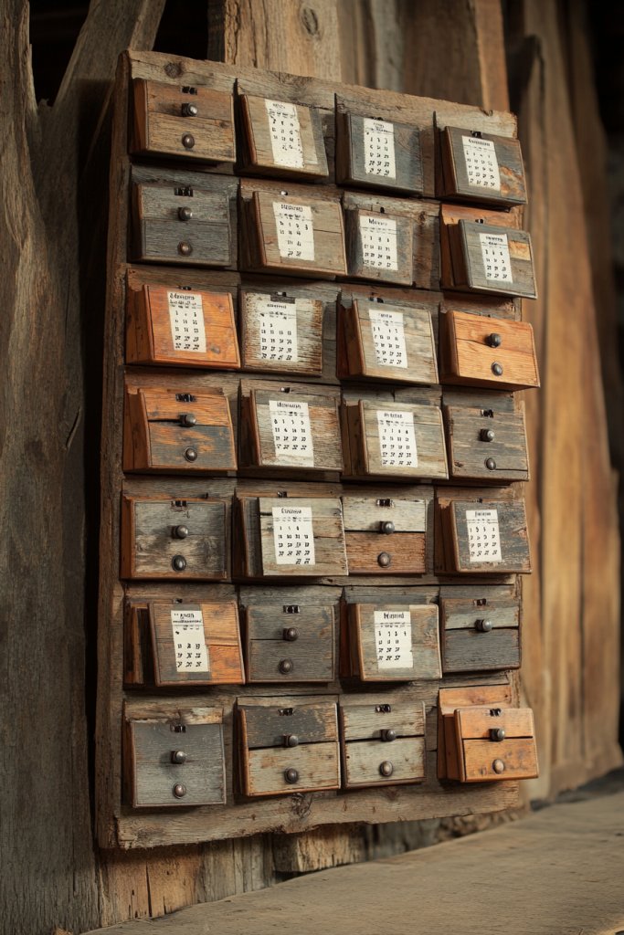 Imagine a series of weathered barn wood panels, each with a repurposed drawer front attached. The drawer fronts act as individual pages or holders for monthly info, with their original knobs or handles adding character. The rough textures and mismatched wood tones give a nostalgic, eclectic vibe. It’s a conversation starter that also keeps your dates organized.