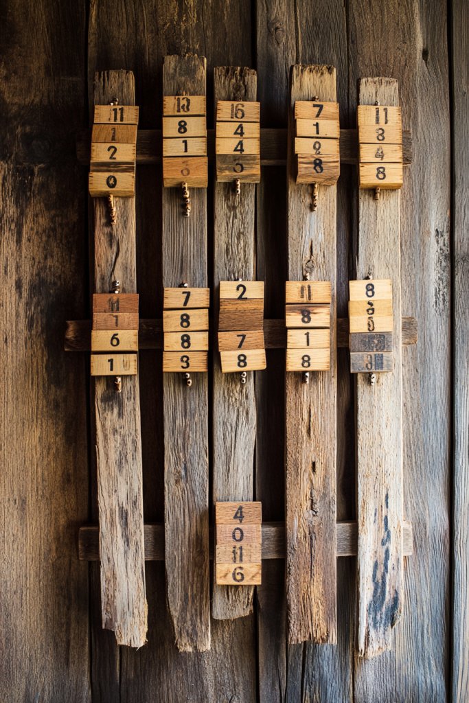 Visualize a series of weathered barn wood panels mounted side by side, each with magnetic strips along the top or sides. Magnetic markers with numbers, days, or notes cling firmly yet easily removable. The natural wood’s grain and imperfections add texture, while the magnetic elements provide a sleek contrast. It’s a dynamic display that invites daily engagement.
