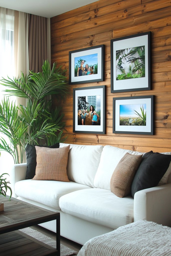 A large frame or a dedicated wall space can work wonders. Arrange your photos in a layout that feels balanced but not overly structured.